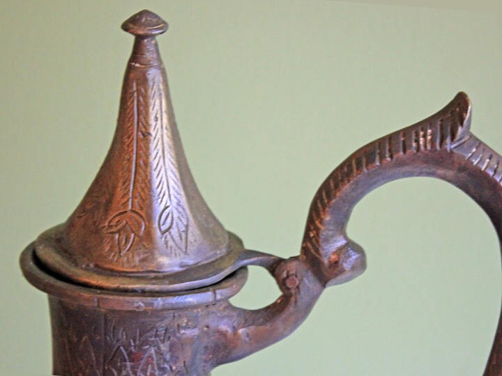 Antique Aftaba Pot. Extra Large Hand Hammered Bronze Pot with Amazing Shapes and Decorative Elements. Water vessel with amazing decorative details. animal heads on the spout and handle. It is a very large item. This is an amazing finding. For collectors of fine metal art. Very heavy and sturdy, 14. 12 lbs. (add more info). Excellent condition.