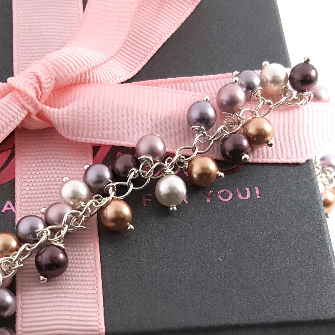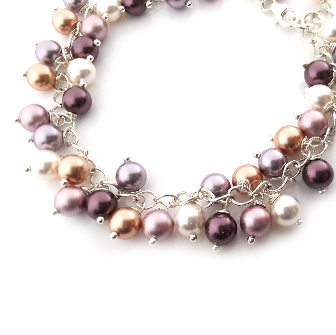 This one of a kind bracelet is made of individually wire wrapped glass swarovski pearls on a sterling silver chain. The pearls are in a variety of purple, lilac, peach and cream colors to create the classic and feminine look. The bracelet is adjustable from 7-8 inches.