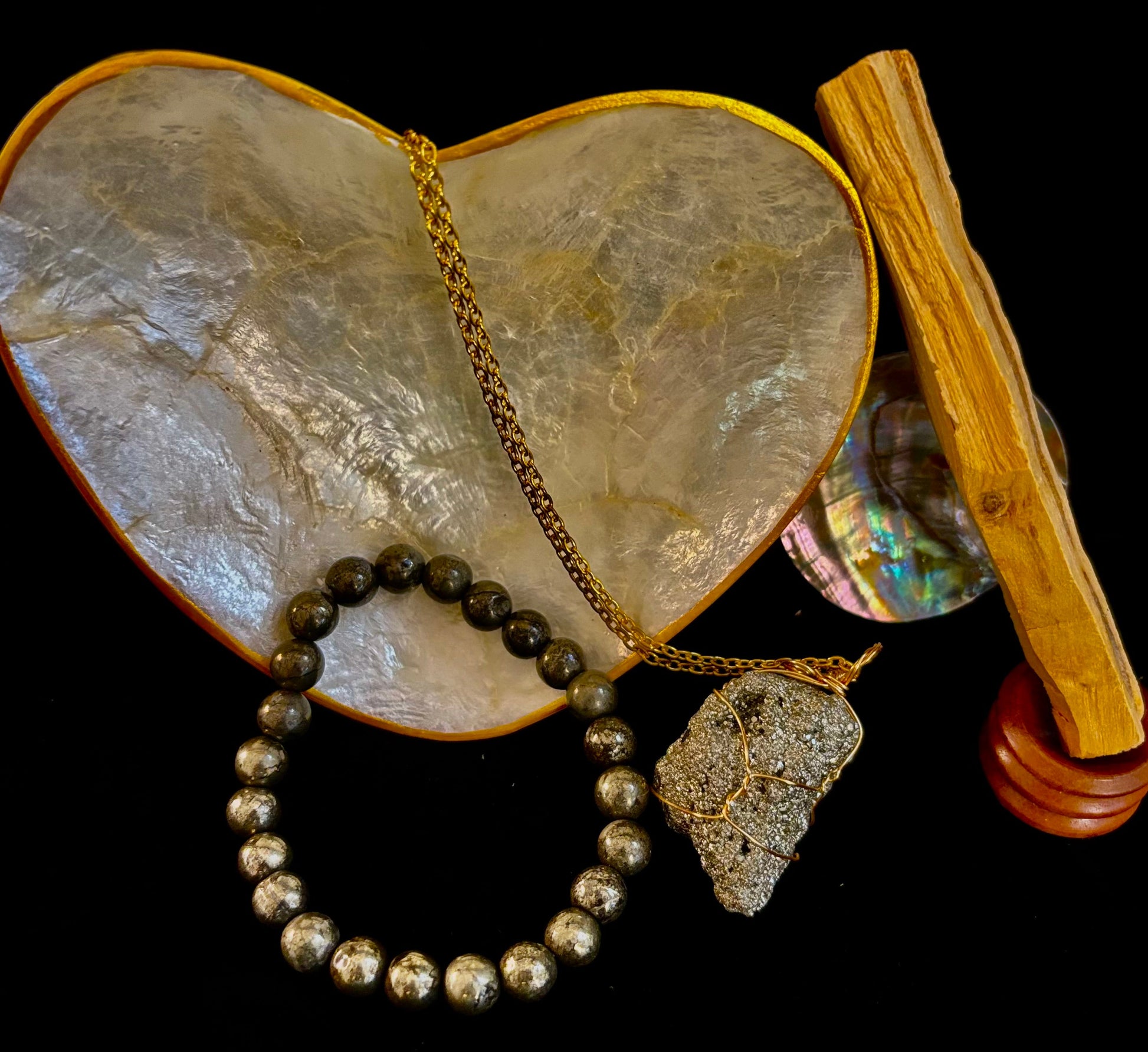 Shine bright with our Pyrite Luxe Collection Gift Box, a luxurious collection of crystals, coastal treasures, and soulful accents designed to bring confidence, protection, and prosperity into your life. Handmade with love and intention, this box is an elegant curation of sacred treasures centered on the Stone of Abundance.