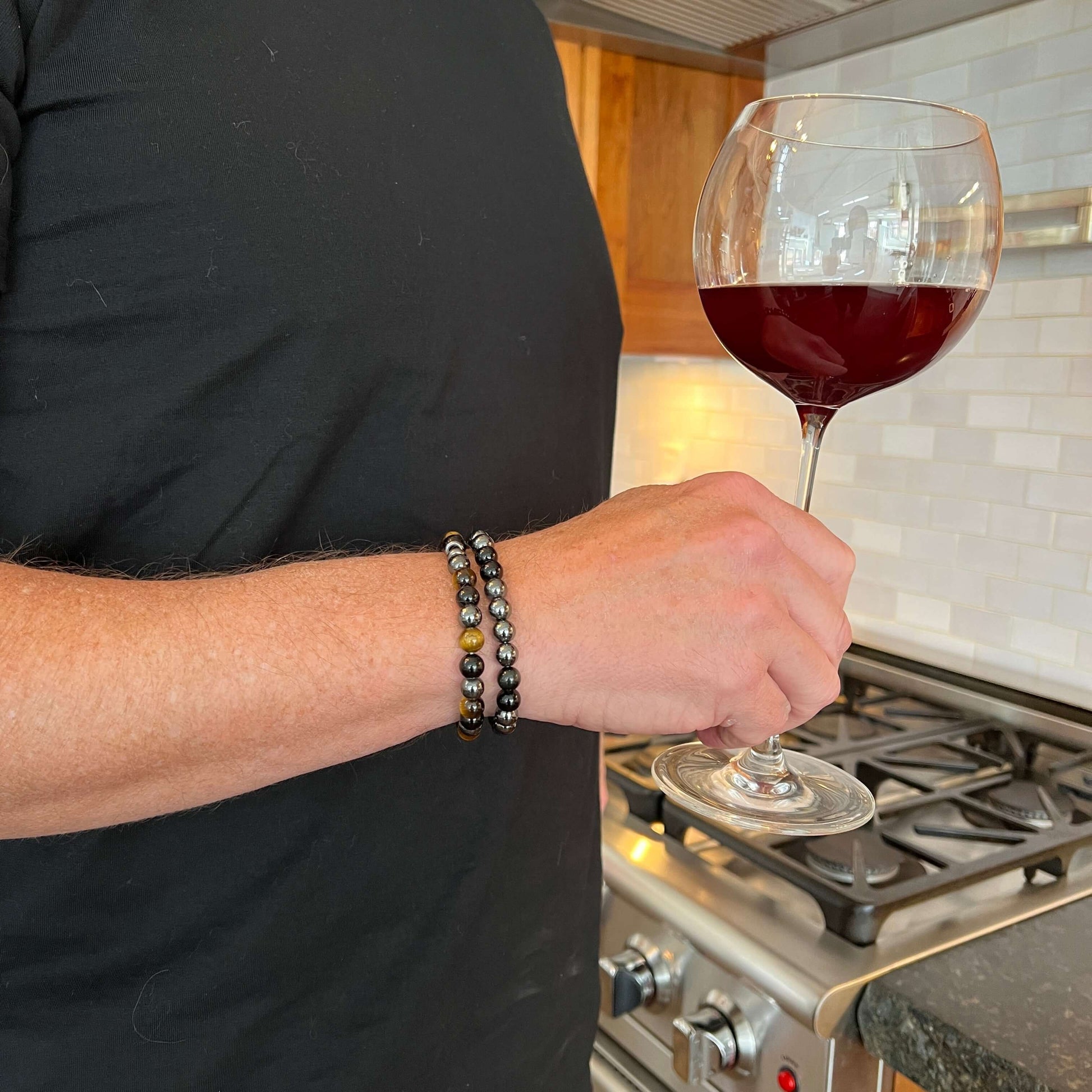 These Power Stone Bracelets are made in two different styles. One with Brown Tiger Eye, Hematite, and Obsidian; the other with Red Tiger Eye, Pyrite, and Sardonyx. The unique combination of these stones bring a strong sense of protection, grounding, and creativity to the wearer.