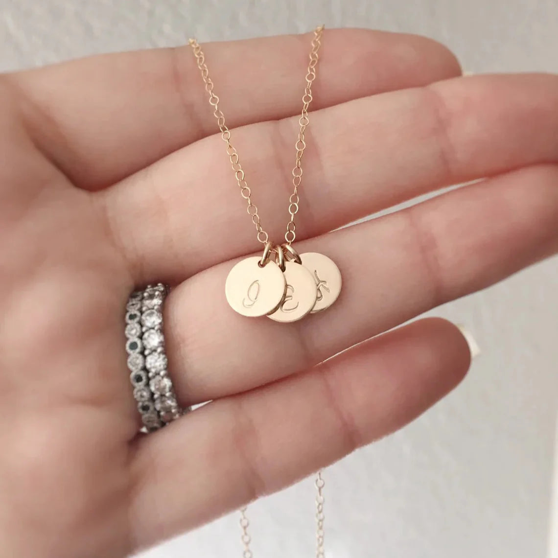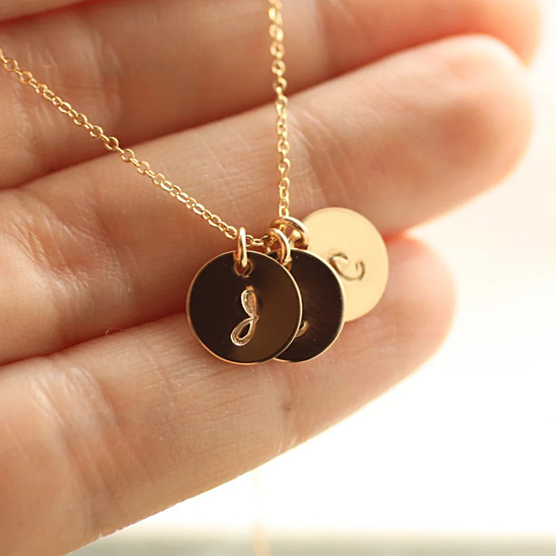 Dainty, personal, and made just for you. This tiny gold initial necklace features one or more 9mm gold-filled discs hand-stamped with your chosen letters. Suspended from a delicate 18" chain, it's perfect for everyday wear and layering.