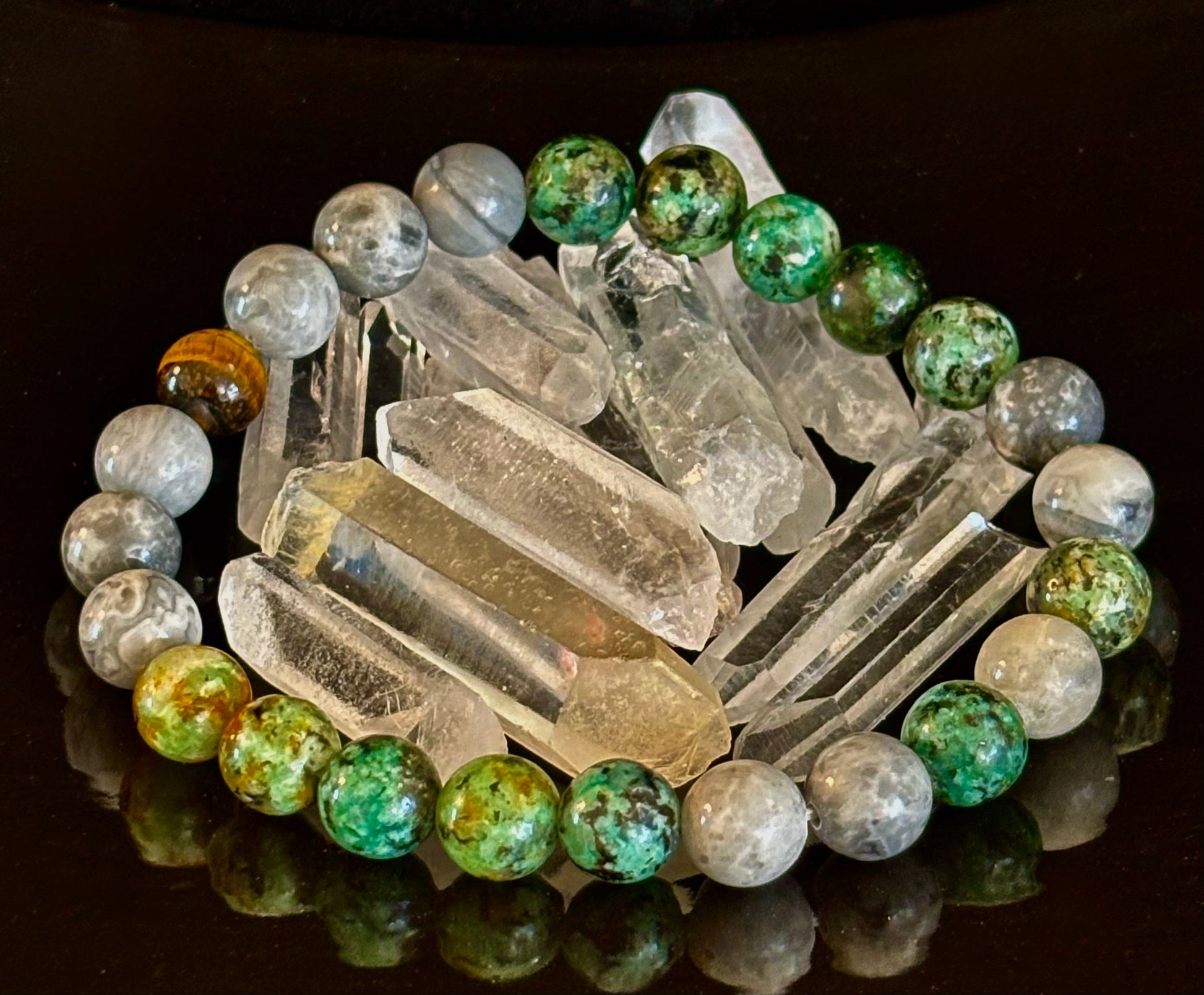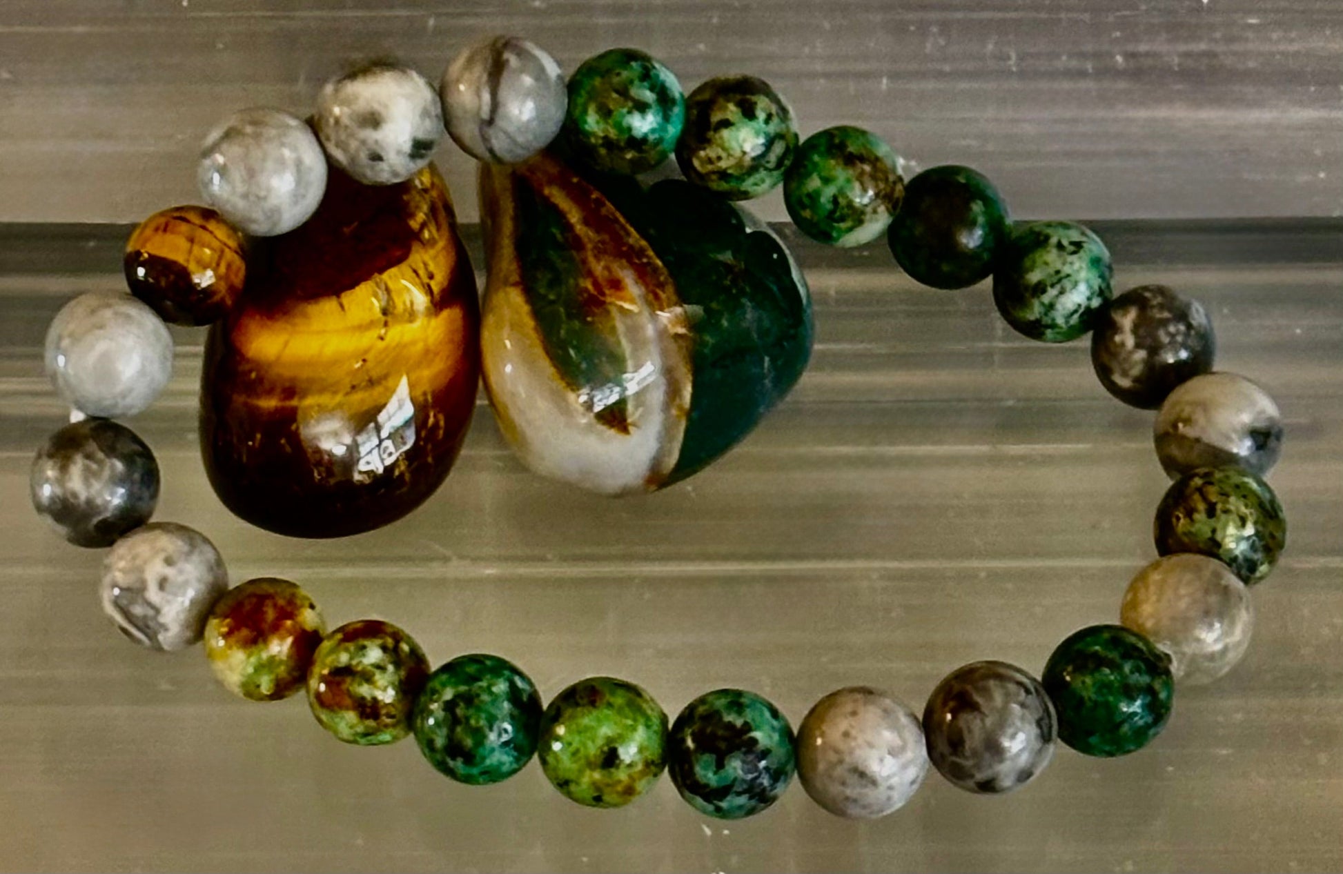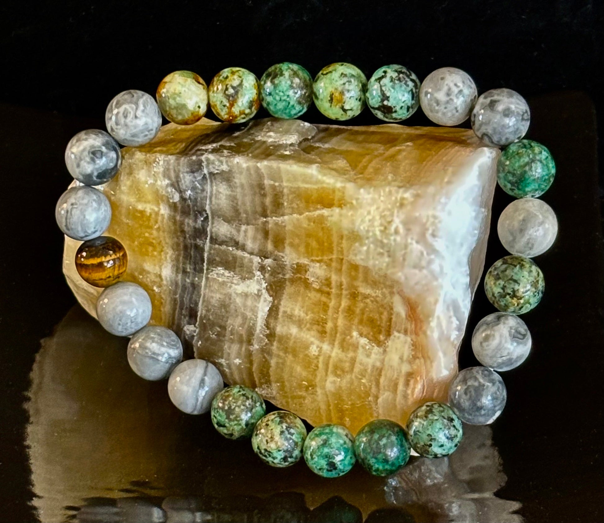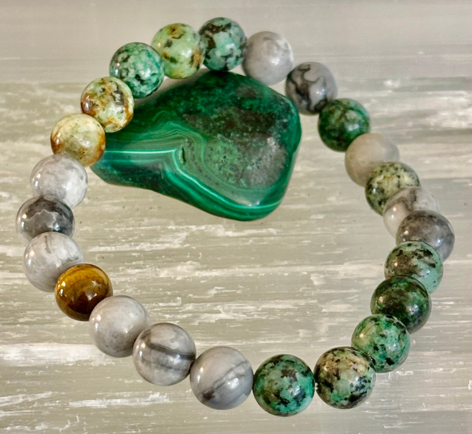 Find your balance with the Tranquil Power Bracelet, a bold yet calming blend of African Turquoise, Tiger Eye, and Map Stone beads, designed specifically for larger wrists with 8mm stones and a flexible stretch fit.