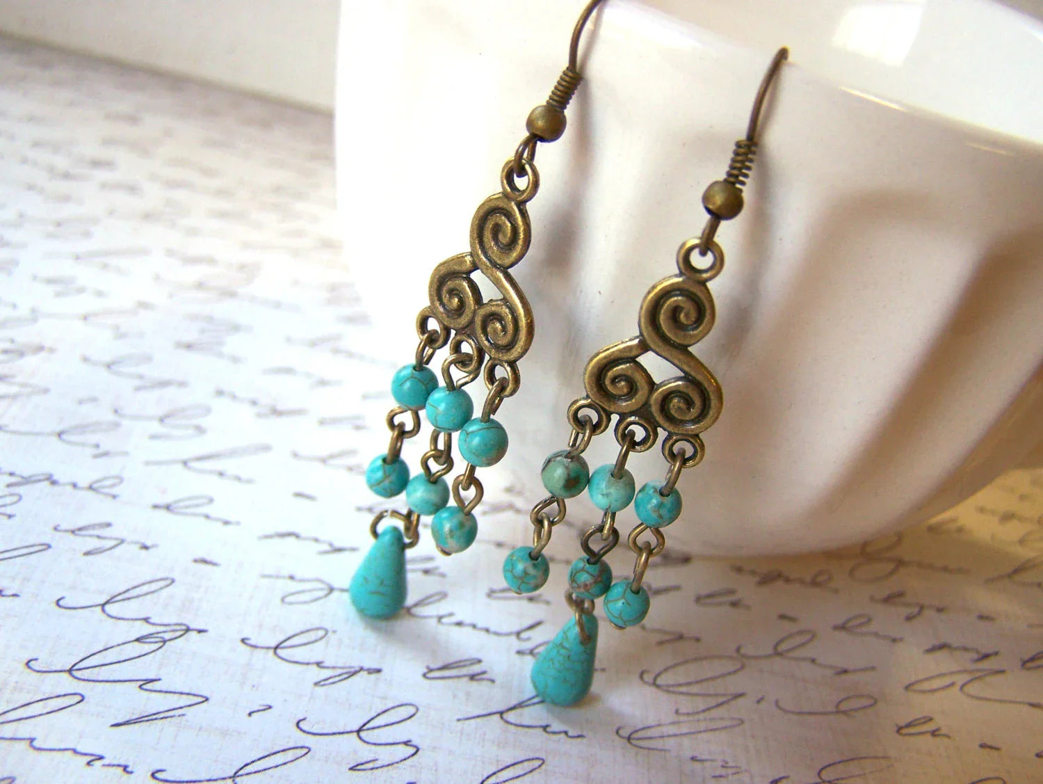 Turquoise and Antiqued Brass Dangle Earrings – Handcrafted, 2.5 Inch
