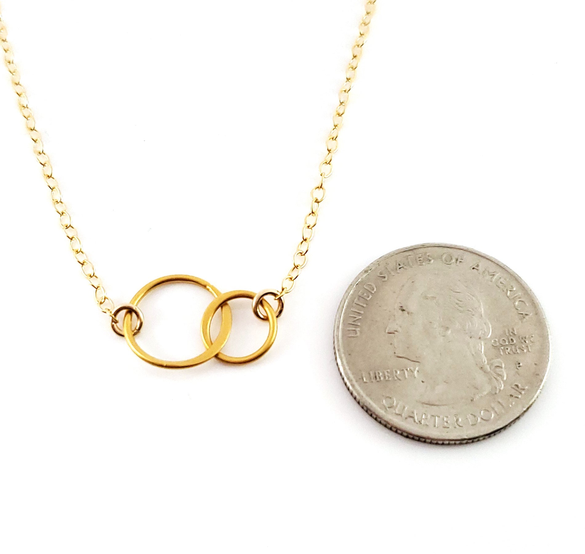 This dainty necklace is handcrafted featuring a detailed Two Circles of Life charm attached to a delicate 18 inch, 14k gold filled cable chain with clasp. Necklace comes on a beautiful insert card, printed on high quality 110lb card stock.