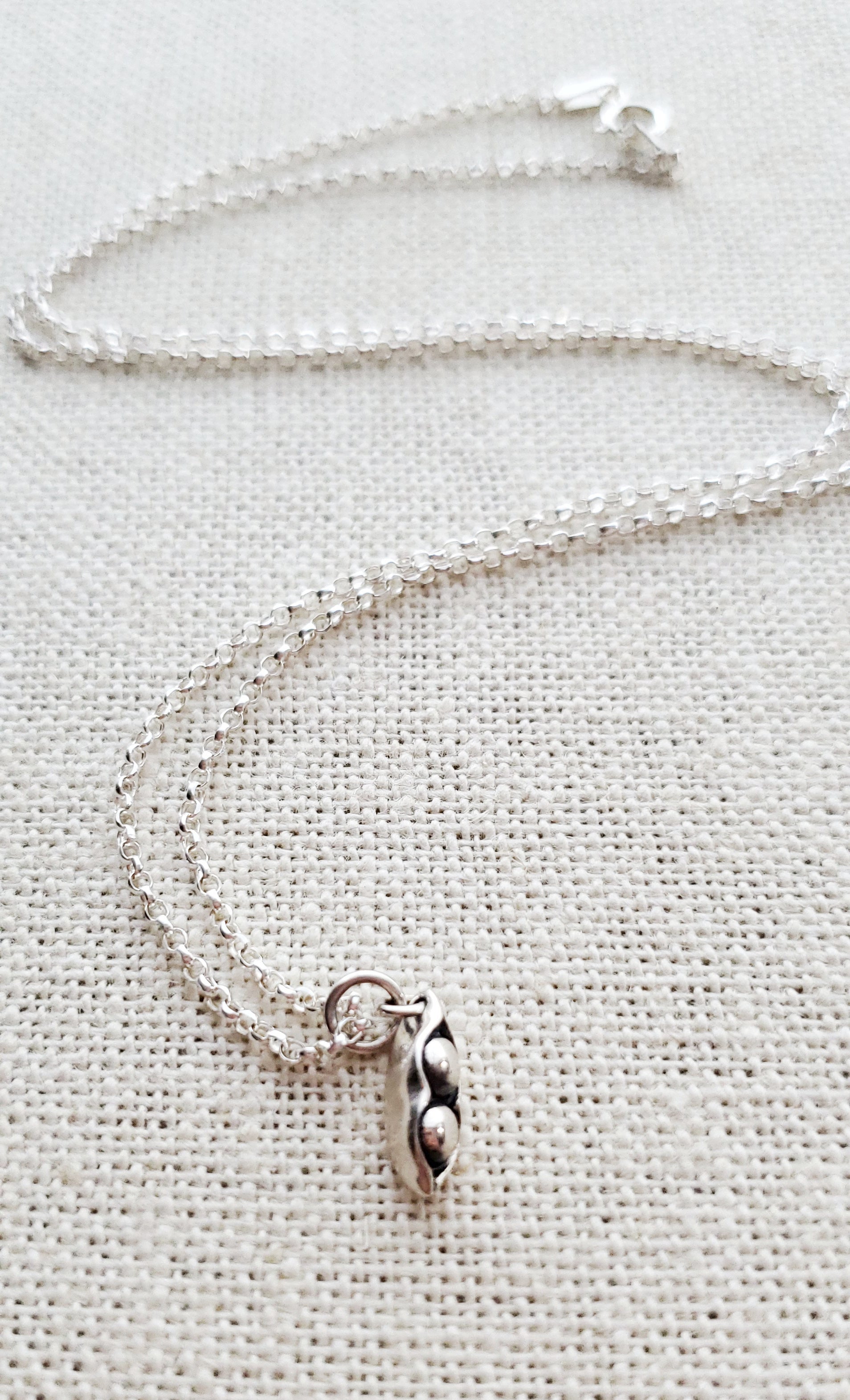 This dainty necklace is handcrafted featuring a detailed Sterling Silver Pea Pod Charm attached to a delicate 18 inch, Sterling Silver cable chain with clasp. Necklace comes on a beautiful insert card, printed on high quality 110lb card stock.