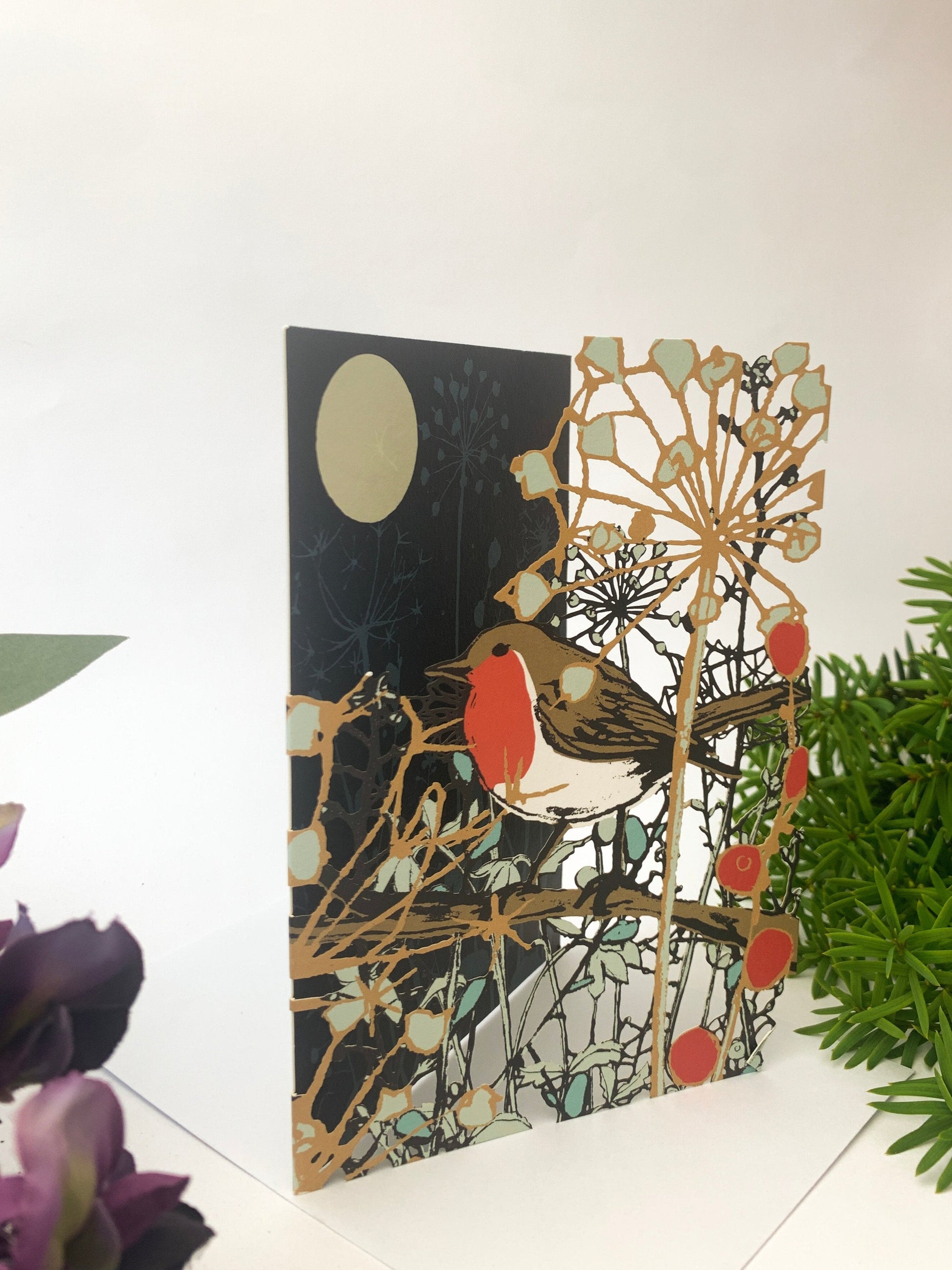 This woodland card celebrates the beauty of winter with a robin on branches against a bold bright moon. It can be used for any winter occasion. The laser stenciling makes it look like the plants are drifting off the page. The front of these cards could be pretty decorations in a window or anywhere the light can go through them.