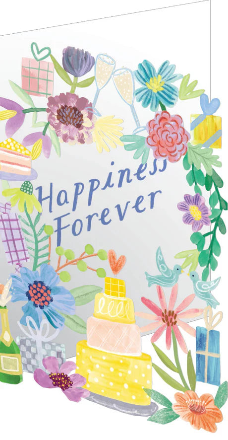 This card shows a very modern and pretty wedding table scene. The message is perfect, "Happiness Forever!"