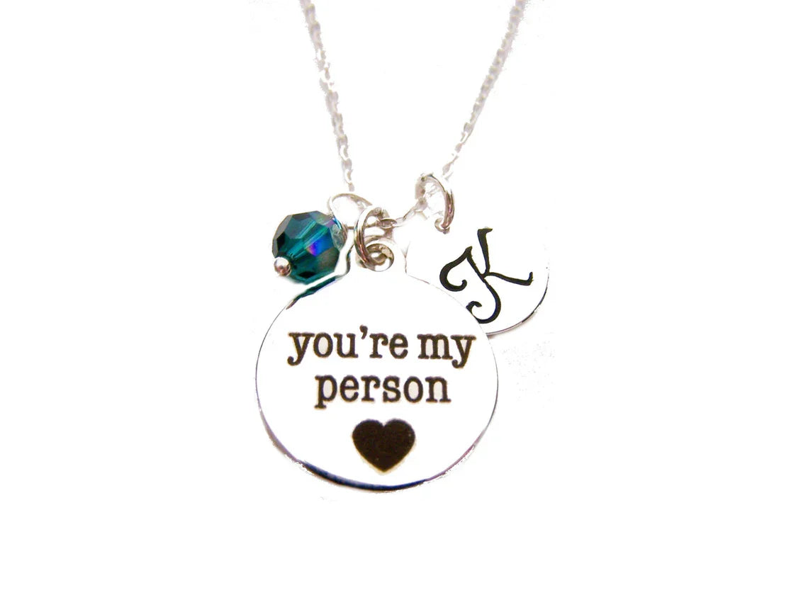 For the one who means everything. This handcrafted necklace features a beautifully detailed "You're My Person" silver charm—a heartfelt reminder of unbreakable bonds. Personalized with a hand-stamped sterling silver initial disc and accented with your choice of a wire-wrapped Swarovski crystal birthstone or a lustrous freshwater pearl, this piece is a meaningful keepsake for your soulmate, best friend, or anyone who holds a special place in your heart. Suspended from an 18-inch sterling silver chain with a secure lobster clasp closure, it’s a timeless gift they’ll cherish.
